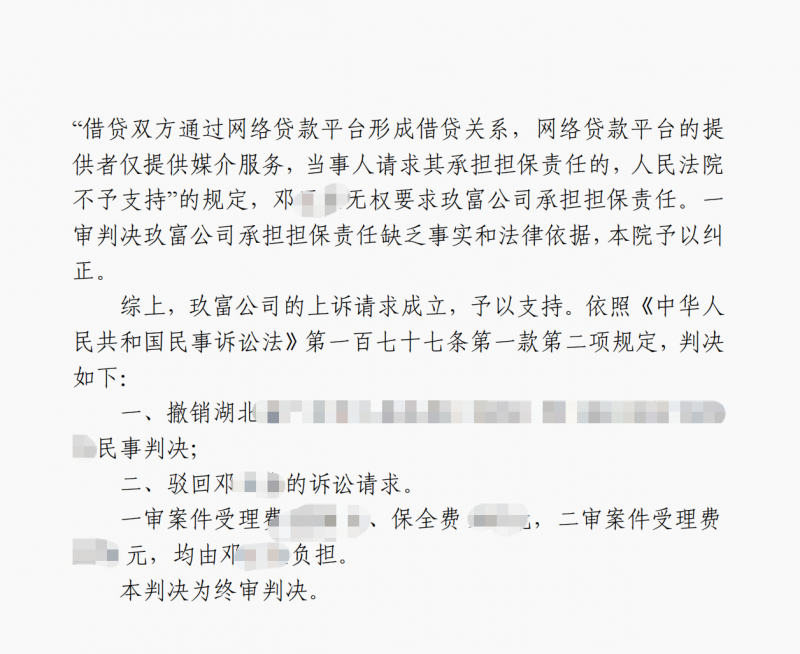 经过审理,湖北省中院认为现有证据表明案涉借款合同中的还款保障措施均明确指向由第三方保险公司或担保公司提供,玖富公司仅作为信息中介与相关方合作引入此类服务,其与出借人签订的协议亦明确排除自身提供担保的承诺;依据《最高人民法院关于审理民间借贷案件适用法律若干问题的规定》第二十二条第一款,网络贷款平台仅提供媒介服务时,出借人请求其承担担保责任于法无据,故一审判决认定玖富公司承担担保责任错误,应予纠正。最终湖北省中院裁定,玖富公司与邓某之间属于居间服务合同关系关系,且不承担担保责任,驳回邓某的诉讼请求。