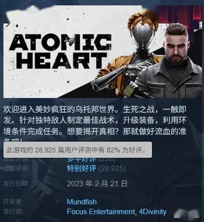在Steam平台上,《原子之心》同样取得了不俗的成绩。其好评率高达82%,被玩家们誉为“特别好评”。这一成绩不仅反映了玩家对游戏内容的认可,也证明了Mundfish在游戏开发方面的实力和潜力。