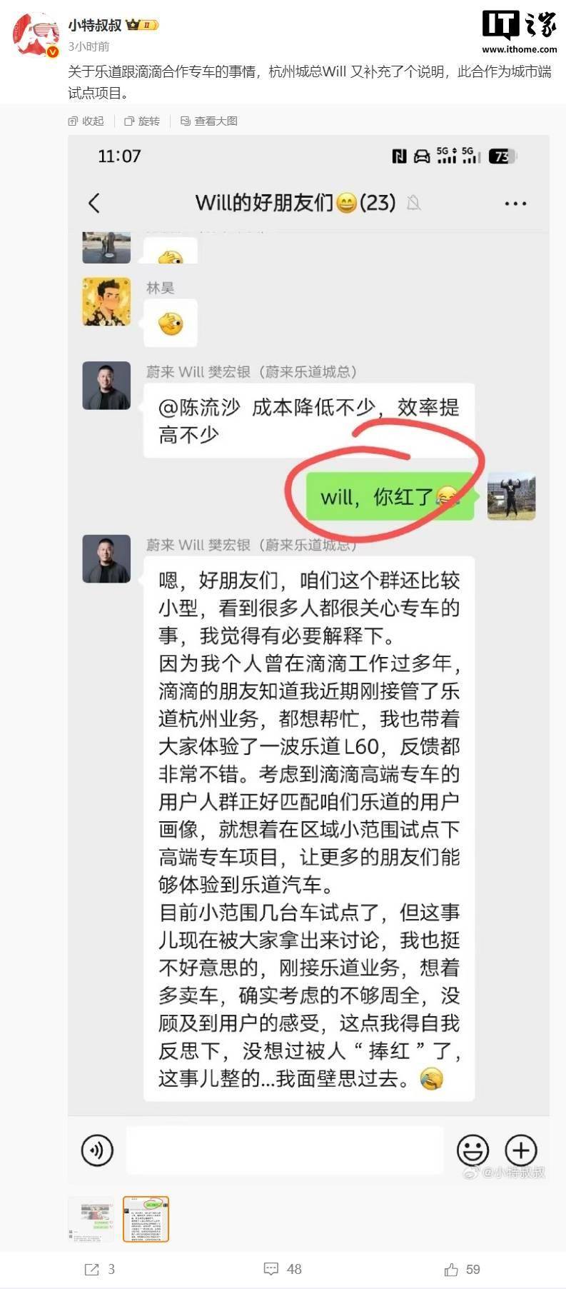 @小特叔叔也在其社交平台上表示,此次乐道汽车与滴滴的合作是一个城市端的试点项目,旨在探索新的市场机遇和服务模式。这一合作不仅有助于提升滴滴专车服务的整体品质,也为乐道汽车打开了新的销售渠道和市场空间。
