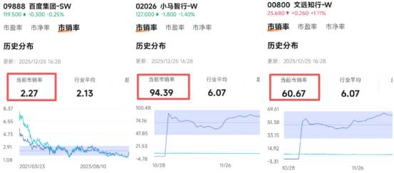 百度核心业务的疲软进一步加剧了投资者担忧。2025年第三季度财报显示,其在线营销收入同比下滑18%,连续多个季度呈现负增长态势。这引发市场对百度能否持续支撑自动驾驶业务巨额投入的质疑——若传统业务无法提供稳定现金流,创新业务的发展或将受到掣肘。这种担忧在资本市场蔓延,导致百度整体市销率仅为2.27倍,远低于同行业小马智行(94.39倍)和文远知行(60.67倍)的估值水平。
