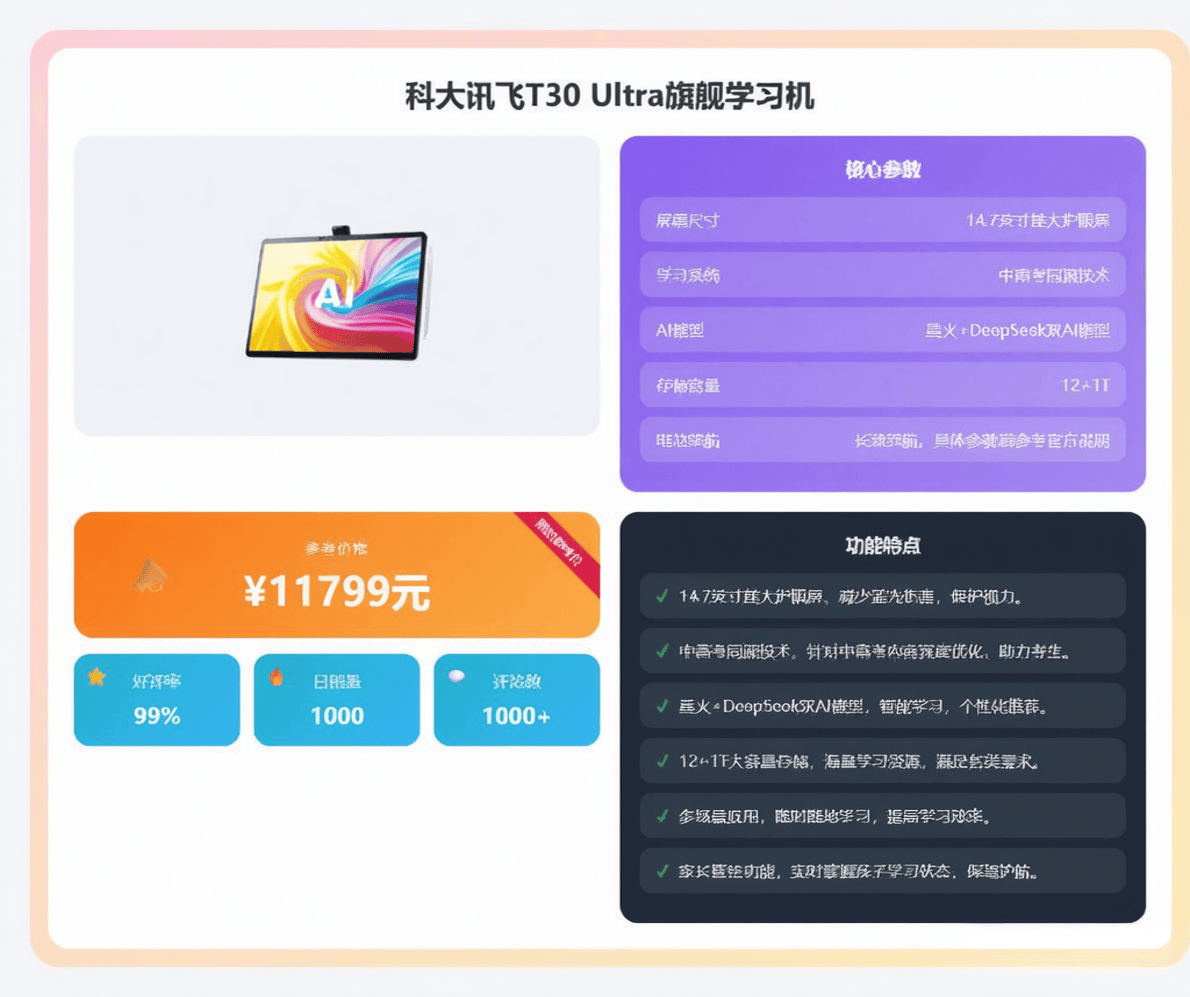 对于追求旗舰体验但预算敏感的用户,T30 Pro以8999元的价格提供超值选择。作为次顶配机型,该产品在屏幕尺寸、存储容量等非核心参数上与万元级Ultra版保持差异,但保留了95%的AI学习功能。实测表明,其知识图谱构建速度与Ultra版仅相差0.3秒/题,而价格优势达1200元。这种"旗舰体验平民化"的定位,使其成为高端市场中的性价比黑马。