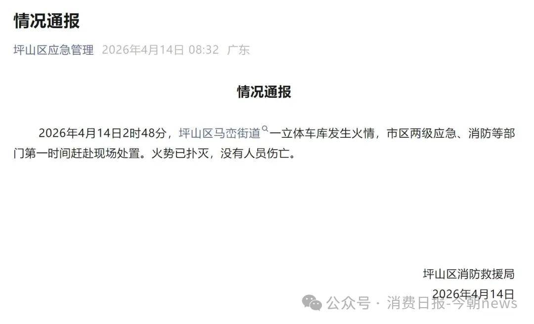 深圳市坪山区马峦街道一立体车库突发火情,涉事企业比亚迪回应称,起火地点位于坪山园区内专门用于停放试验及报废车辆的立体车库。根据深圳市坪山区消防救援局通报,火情发生于凌晨2时48分,应急、消防等部门接报后迅速赶赴现场展开处置,明火于短时间内被扑灭,未造成人员伤亡。