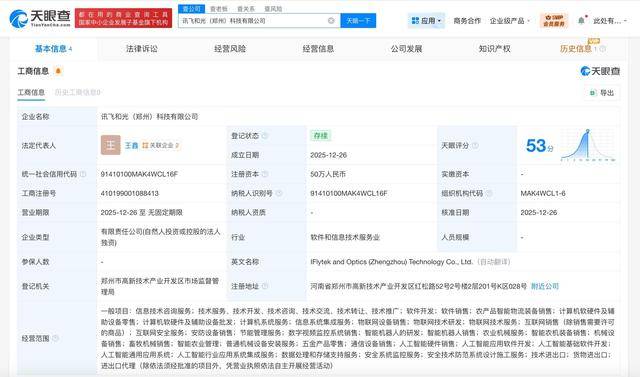 工商信息平台天眼查最新数据显示,一家名为讯飞和光(郑州)科技有限公司的新企业完成注册登记。该企业法定代表人为王鑫,注册资本设定为50万元人民币,注册地位于河南省郑州市。
