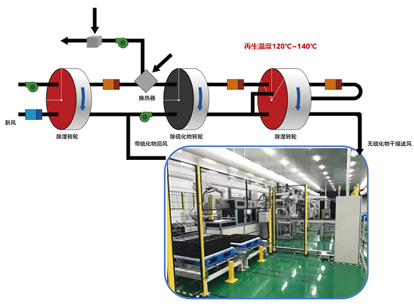 规模化生产中,除尘与除湿系统的除硫方案主要有三种:活性炭+金属氧化物复合吸附、H2S吸附转轮单独应用或组合应用。经济性对比显示,活性炭方案初投资较低但运行成本高,转轮方案初投资较高但维护成本低,长期运行更具优势。具体选择需根据产线规模、能耗要求及环保标准综合评估。