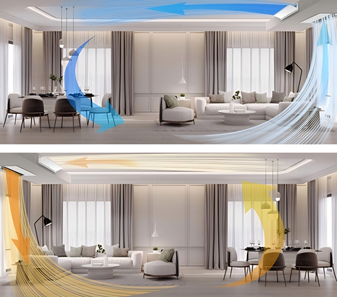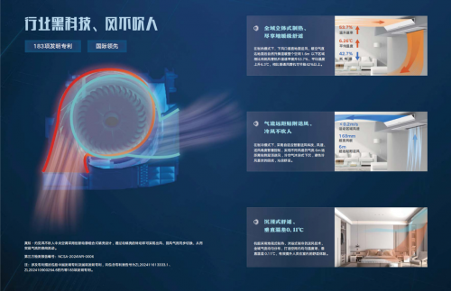这一技术创新性地采用上下双出风口设计,实现冷热分送:冷风沿天花板自然沉降,热风从底部缓缓升腾,“沐浴式制冷”与“地暖式制热”的构想首次落地。