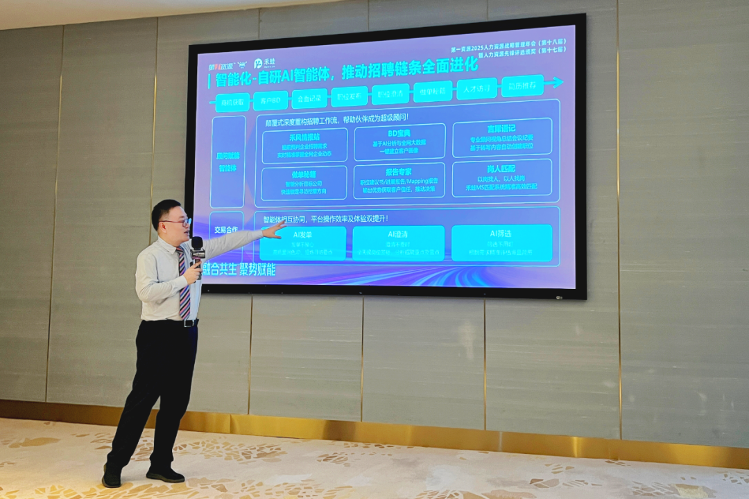 在企业海外综合服务体系构建论坛上,禾蛙联合创始人杨展发表题为《AI智驱・聚势出海——构建面向未来的智能招聘新基建》的演讲。演讲以行业演进趋势为切入点,结合实战案例,为打造智能化全球招聘供应链提供可行路径。