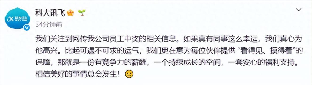 科大讯飞回应员工中1500万彩票离职传闻:若属实为其高兴,更重为员工筑牢保障